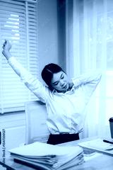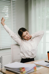 A young Asian woman stretches at her office desk, taking a peaceful break from work.