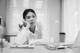 A young Asian woman stretches at her office desk, taking a peaceful break from work.