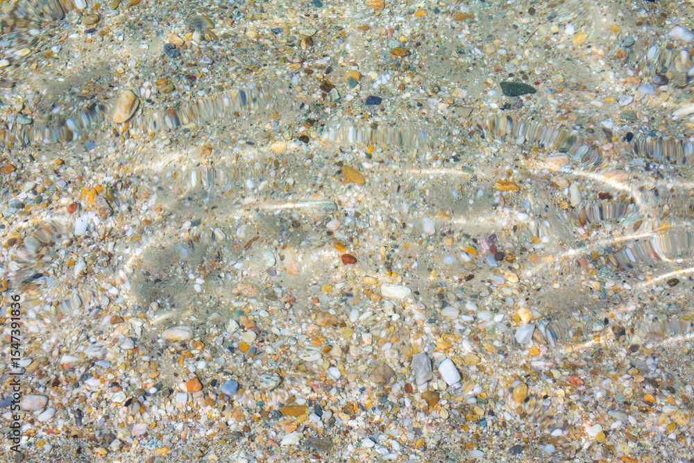 Background with pebbles and sand under water at the coast of Mediterranean sea