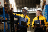 Worker checking on shelf with digital tablet in warehouse. Professional workers management business delivery import - export online stock for logistics.