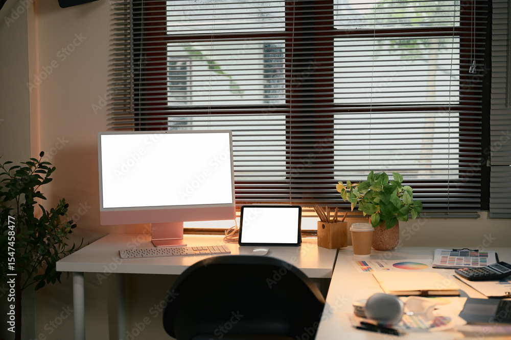 Graphic designer workspace with desktop monitor, digital tablet, color charts, and creative tools