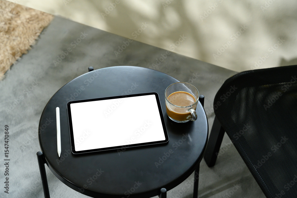 Digital tablet with blank screen, stylus, and coffee cup on modern black table