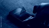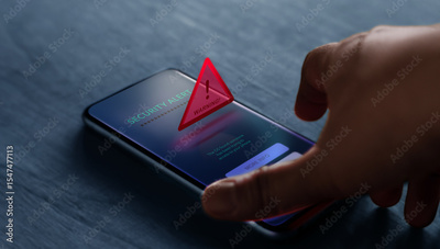 A smartphone displays a cybersecurity alert, highlighting risks of cybercrime, data breach, and digital vulnerability