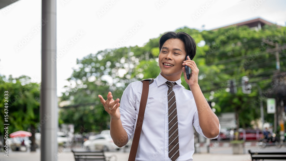 Smiling male office worker talking on his smartphone with a hand raising while standing in the park.