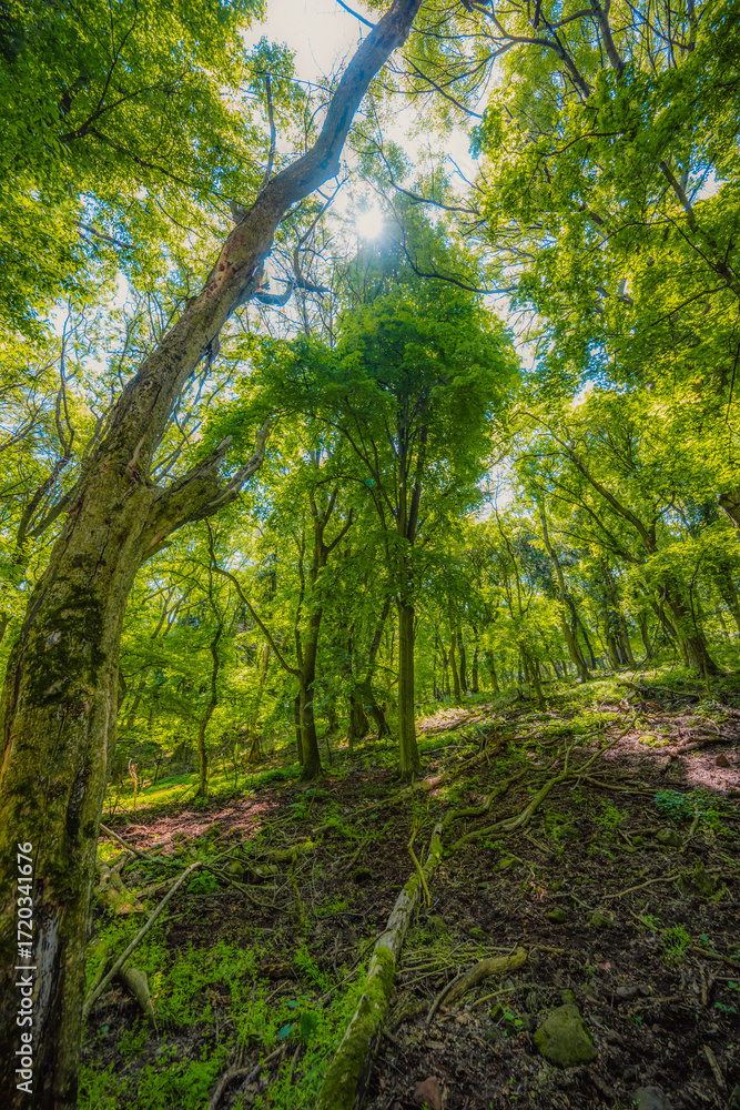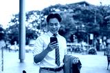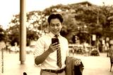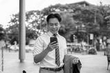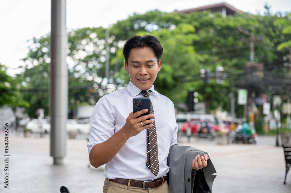 Smiling male office worker holding his phone with suit jacket draped on his arm while standing in the park.