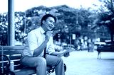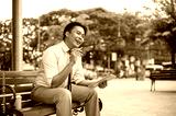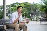Male office worker holding stylus and tablet thinking happily while sitting on steel bench in park.