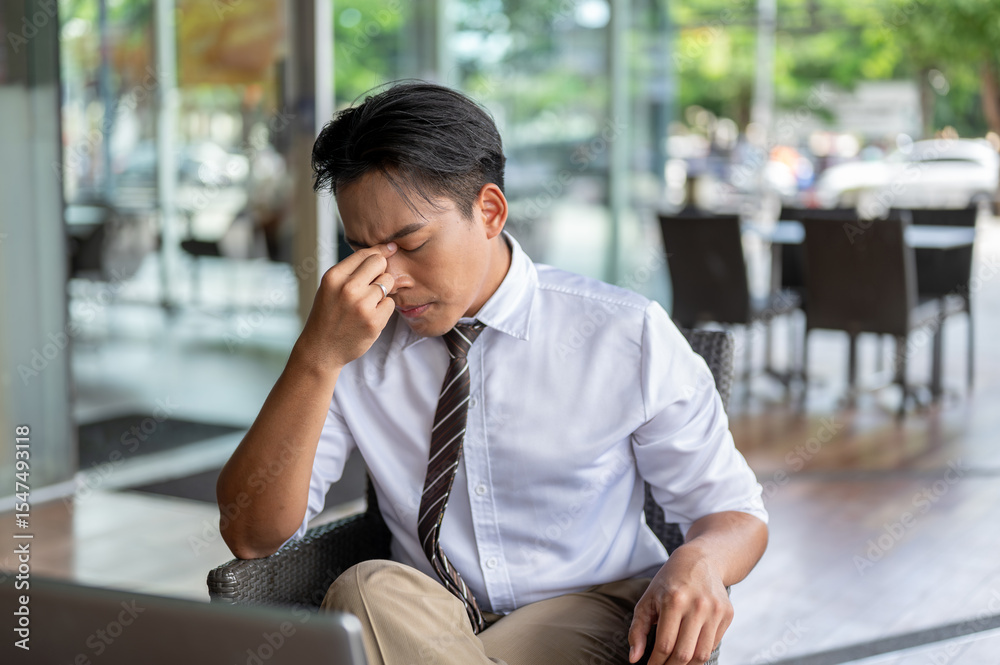 Male office worker massaging rubbing his eyes while sitting in front of laptop at cafe or coffeeshop