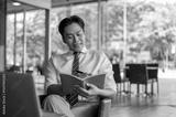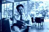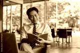 Male office worker holding pen writing in notebook as sitting at wooden table in cafe or coffee shop