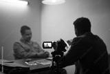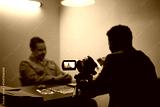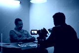 Caucasian middle aged man in orange prison uniform sitting at table during interrogation, Black man in suit interviewing and recording conversation with video camera in dimly lit room