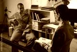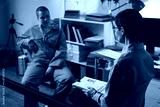 Caucasian teenage boy wearing prison uniform, sitting in office talking to middle aged Caucasian woman psychologist holding clipboard during prison counseling session