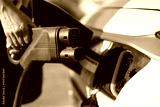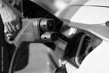 Mechanic plugging charging cable into electric car at station - sustainability and clean energy concept