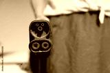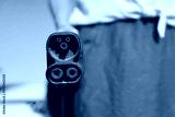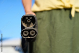 Mechanic holding electric car charger connector on blurred background - sustainability and clean energy concept