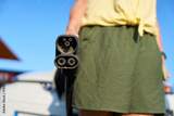 Woman holding electric car charger connector at charging station - sustainability and clean energy concept