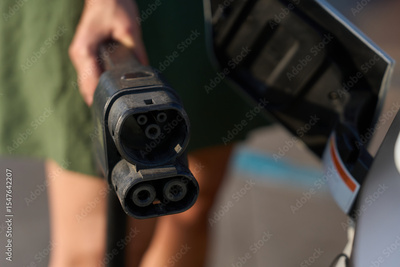 Woman holding electric car charger ready to plug into vehicle - sustainability and clean energy concept