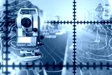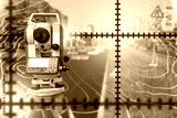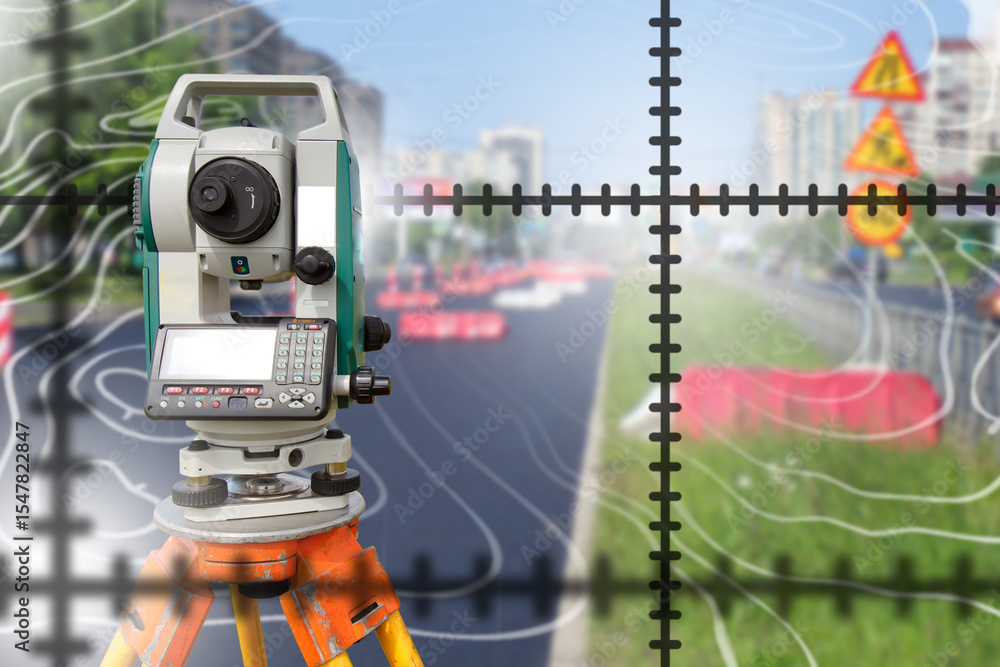 Geodetic equipment. Road construction. Device for creating topographic maps. Geodetic surveys during construction. Road infrastructure design. Geodetic surveys. Street with topographic lines