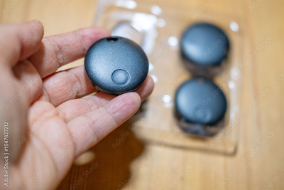 Hand holding smart tracker device, symbolizing personal item tracking and loss prevention, security and peace of mind through item tracking, personal tracking technology, lost items
