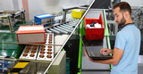 Man production line operator. Conveyor to increase production productivity. Casual production line operator. Business man controls conveyors via computer. Cardboxes on industrial line
