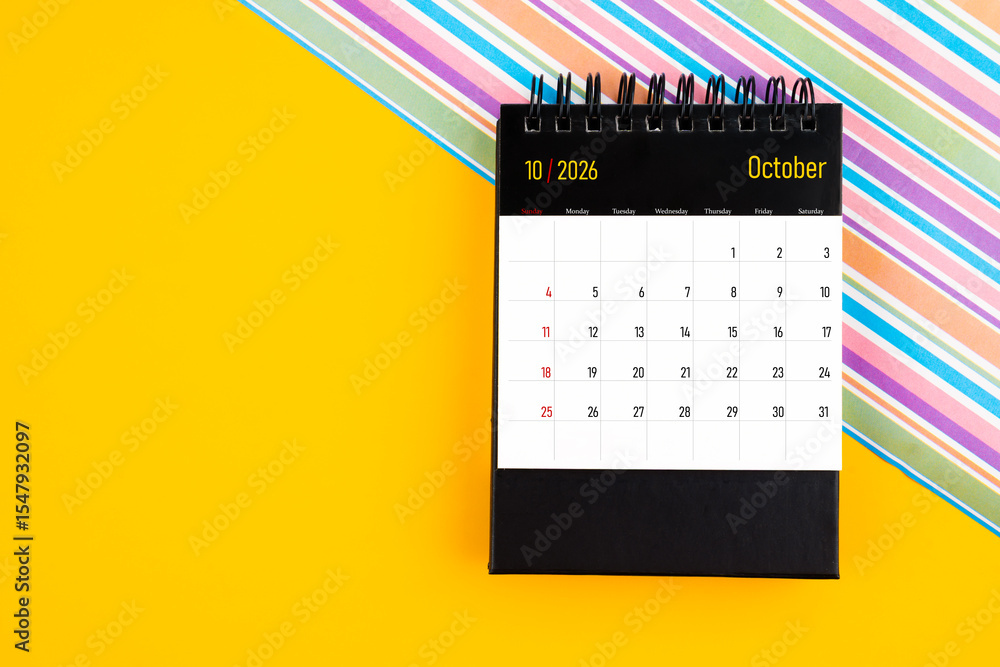 Desk calendar for October 2026 year on yellow color background, Position with copy space.