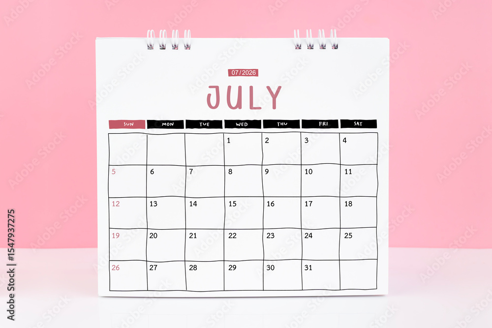 Desk calendar for July 2026 on a pink color background with copy space.