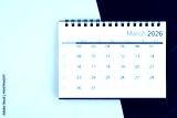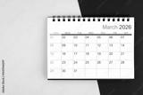 March 2026 desk calendar on pink and black color background, Flat lay.