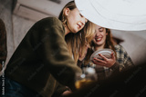 Young women are socializing indoors, sharing joy and creating memories in a warm and relaxed atmosphere. The setting exudes comfort, reinforcing the bonds of their friendship through simple moments.