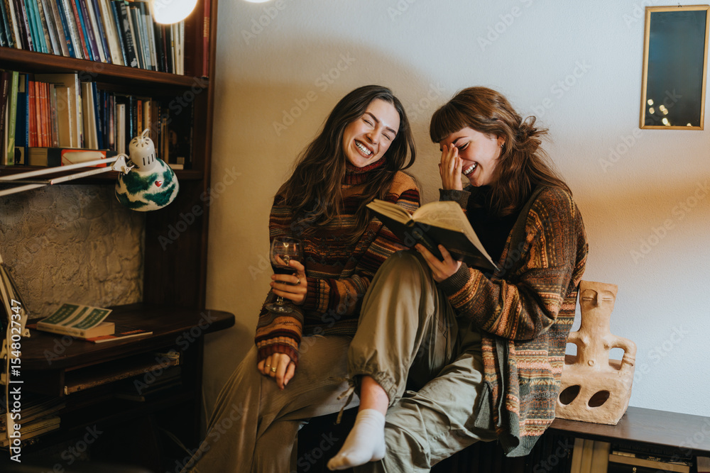 Two women enjoy a relaxed and warm moment together in a cozy library setting, sharing laughter over a book, surrounded by bookshelves and soft lighting, symbolizing friendship and happiness.