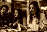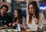 A group of friends enjoying delicious food and sharing conversations in a stylish bar setting, showcasing togetherness and a lively atmosphere.