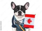 Cute puppy, Canadian Flag, work overalls and pliers. Closeup, indoors. Studio shot. Congratulations for family, relatives, loved ones, friends and colleagues. Pets care concept