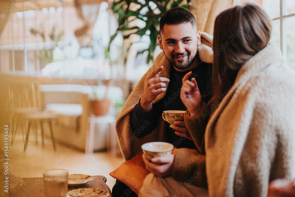 Close-up of a smiling man and woman chatting while enjoying drinks, wrapped in blankets, in a modern cafe setting, evoking feelings of warmth, friendship, and relaxation.