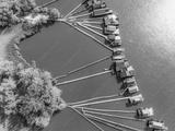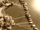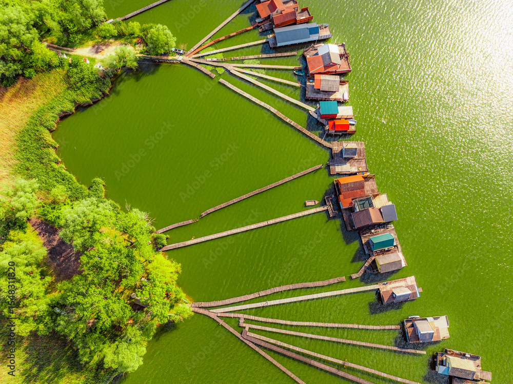 Floating village Bokodi in Hungary. Houses belong to local fishermen. aerial
