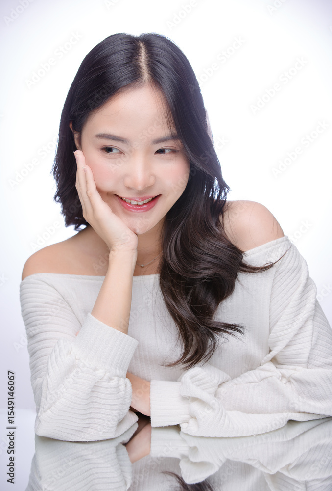 Portrait happy cheerful young asian beautiful woman clean fresh skin, showcasing healthy and wellness smile look at camera on white background Ideal facial skincare glowing beauty treatment promotions