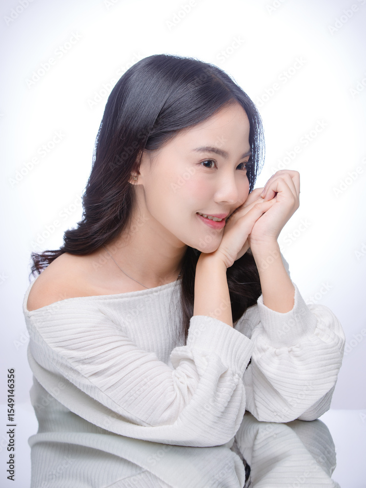 Portrait happy cheerful young asian beautiful woman clean fresh skin, showcasing healthy and wellness smile look at camera on white background Ideal facial skincare glowing beauty treatment promotions
