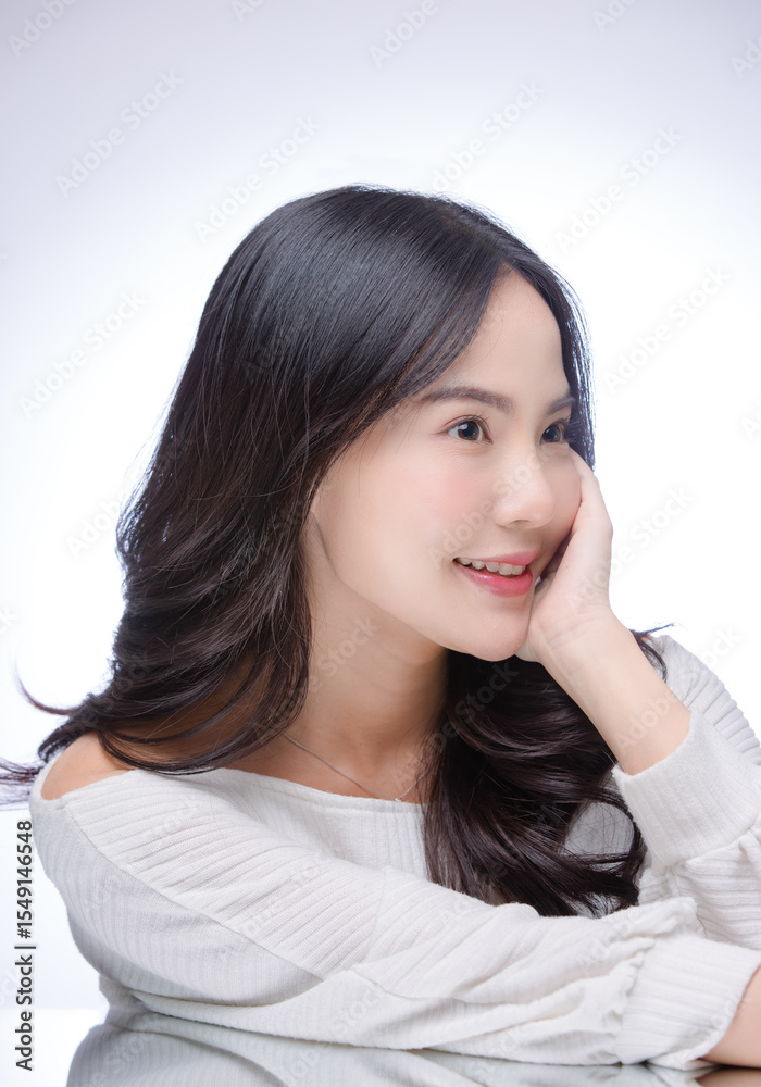 Portrait happy cheerful young asian beautiful woman clean fresh skin, showcasing healthy and wellness smile look at camera on white background Ideal facial skincare glowing beauty treatment promotions