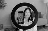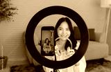 Close up mobile phone digital camera asian young beautiful happy funny woman smile live broadcast sharing on social network at home influencer vlogger blogger recording video media marketing online.
