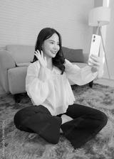 Asian young beautiful happy woman wears casual clothes smile holding using mobile phone, smartphone media, using apps shopping online reading news sitting on floor in light blue living room at home.