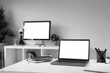 Modern office desk with laptop and desktop monitor, both featuring blank white screens