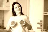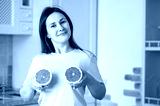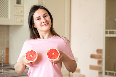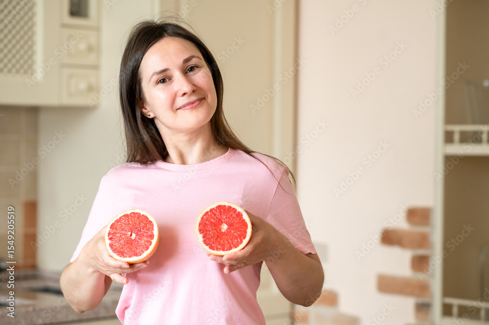 Cheerful woman shows grapefruit halves on her chest to promote healthy eating and lifestyle