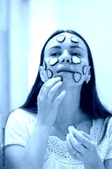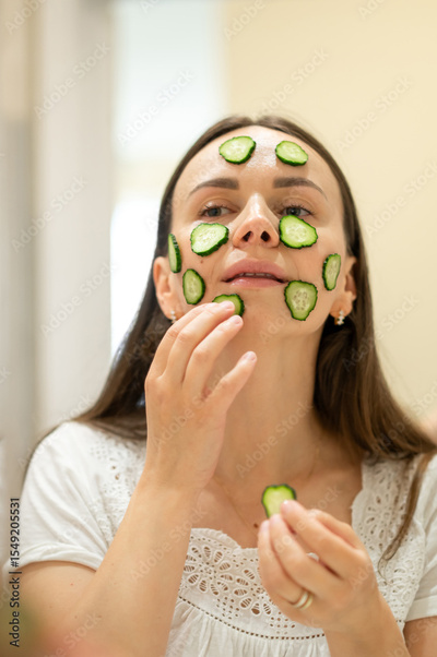 reflection of a woman in a mirror who puts cucumber slices on her face, face mask