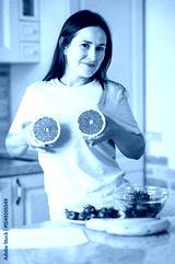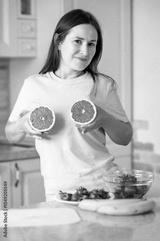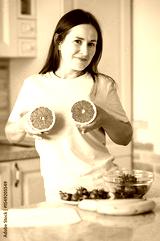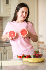 Cheerful woman shows grapefruit halves on her chest to promote healthy eating and lifestyle