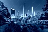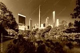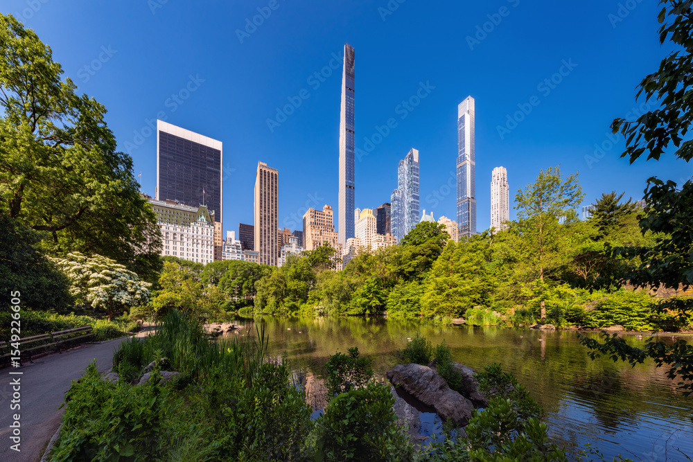 Central Park by The Pond on Summer morning with Billionaires Row supertall skyscrapers. Midtown Manhattan, New York City
