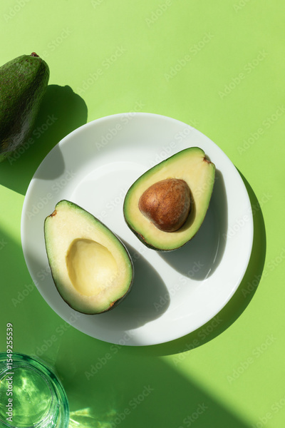 Avocado fruit cut on half on thе white plate with glass of water on the green table background. Top view