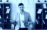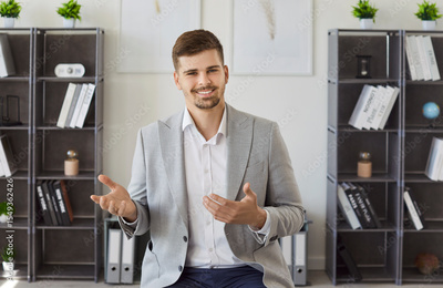 Portrait of cheerful young man in formal suit looking at camera having video call sitting on workplace in modern office. Confident company employee chatting online during conference call.