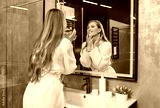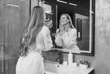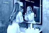 Smiling woman looks in mirror and tends to skin during morning routine in bathroom at home, emphasizing daily beauty care, bright moment in a personal space focused on hygiene and self-love.