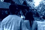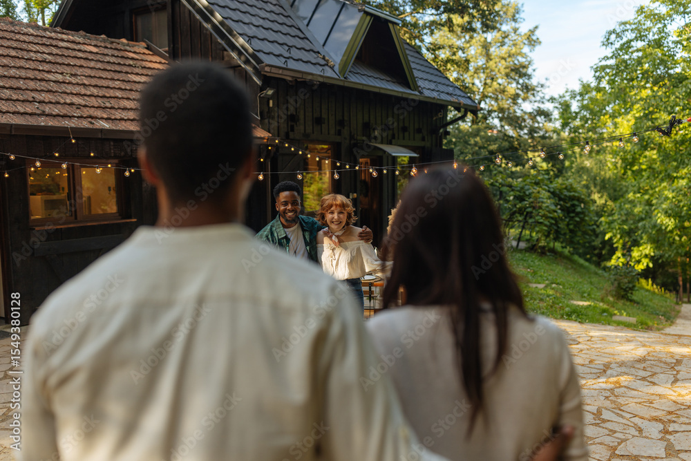 A couple welcoming another couple to their wooden cabin