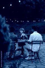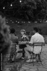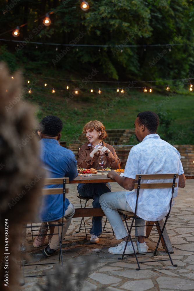 Group of people sitting outside, having dinner and talking