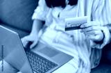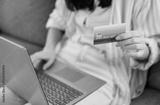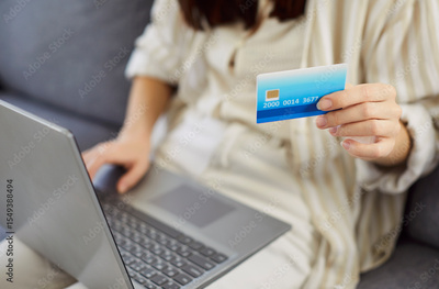 Close-up of woman using credit card and laptop for online shopping at home, completing purchase with transaction payment, engaging in digital commerce in a personal space focused on convenience.