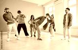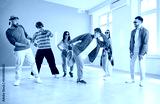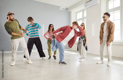 Hip hop dance of young dancer at choreography lesson in studio. Boy teenager dancing to music among group of smiling students, performing creative dance moves in gym. Freestyle, youth concept
