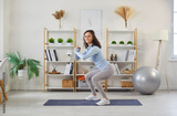 Active woman performs squats during fitness training in home gym, engaging in sport workout, physical strength in a personal space designed for exercise and dedicated fitness improvement efforts.