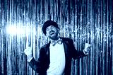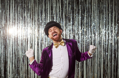 Portrait of happy funny man wearing bright purple suit, gloves and hat having fun on shiny silver foil background. Excited smiling showman dancing at disco party. Celebration concept.