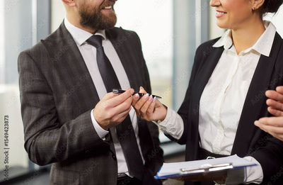 Cropped image of businessman giving pen to businesswoman for signing documents, affirming partnership agreement, putting signature at official paper, have good business deal together